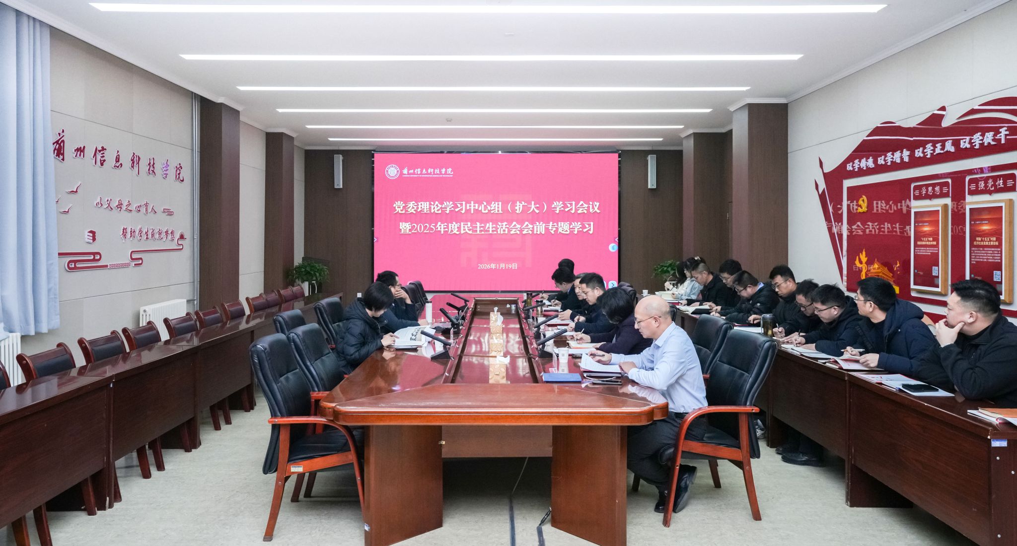 为夯实民主生活会思想基础,提升理论武装实效。1月19日,学校党委理论学习中心组召开2026年第一次集中学习会暨民主生活会会前专题学习会,将中心组常态化理论学习与民主生活会会前专题研讨有机融合、一体推进。甘肃省工业和信息化厅技术创新处处长张志春应邀作党的二十届四中全会精神专题辅导报告。校长周刚结合学校发展实际作交流发言,党委书记周怀春主持会议并总结讲话。