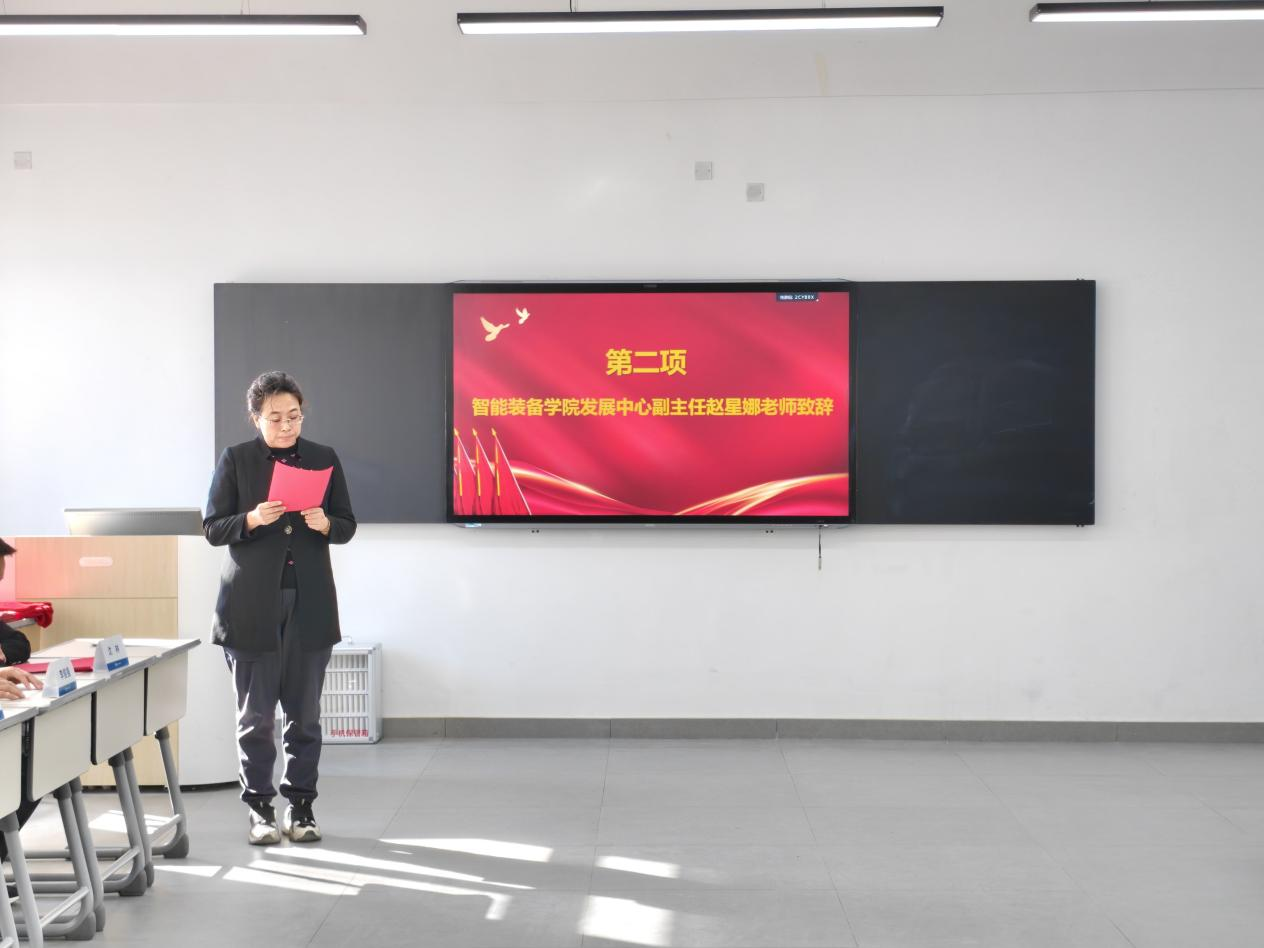 仪式在庄严的国歌声中拉开帷幕,全体人员肃立齐唱,铿锵旋律凝聚起听党话、跟党走的坚定信念。学生发展中心副主任赵星娜在致辞中指出,“智芯之火”党建工作室的命名,既精准契合学院智能制造、电气工程及其自动化等核心专业的“智芯”学科特质,更蕴含红色基因与专业初心薪火相传的深刻寓意。她强调,工作室作为学院学生党建工作的重要实践载体,需立足学科优势,推动党建工作与专业学习、技能实训、科技创新深度融合,让红色基因融入“智芯”血脉、赋能成长之路,着力培养兼具坚定理想信念与过硬专业本领的青年人才,为学院高质量发展注入强劲青春动能。