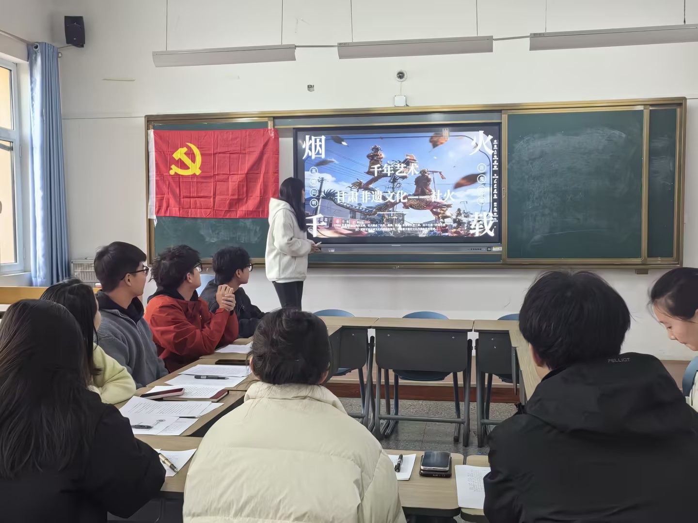 王英兰同志以一段生动的社火主题视频开篇,迅速拉近了青年党员与这一传统非遗文化的距离,随后围绕甘肃社火的历史源流、表演形式、文化价值与传承发展四大板块,进行了系统细致的讲解。她梳理了社火从远古祭祀、驱邪逐疫的民俗活动,逐步融合傩舞、戏曲、杂耍等元素,发展成为集歌舞、戏曲、杂技于一体的民间艺术的完整脉络,生动阐释了其作为“陇原年味活化石”的独特地位,将这一极具地域特色的非遗文化与党性教育、思想引领深度融合。她强调,甘肃社火作为西北黄土文化的活态载体,承载着西北人民的家国情怀、凝聚着深厚的乡土认同,更是涵养青年党员党性修养、厚植文化自信的鲜活教材。